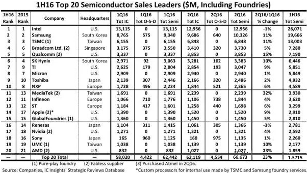 Recently, the semiconductor market research firm IC Insights published in 2016 in the first half of the top 20 largest semiconductor (including integrated circuits, optoelectronic devices, sensors and discrete device) sales rankings. Top 20 largest semiconductor company exclusive eight in the United States, Japan, Europe, China Taiwan three each, South Korea two, one in Singapore.